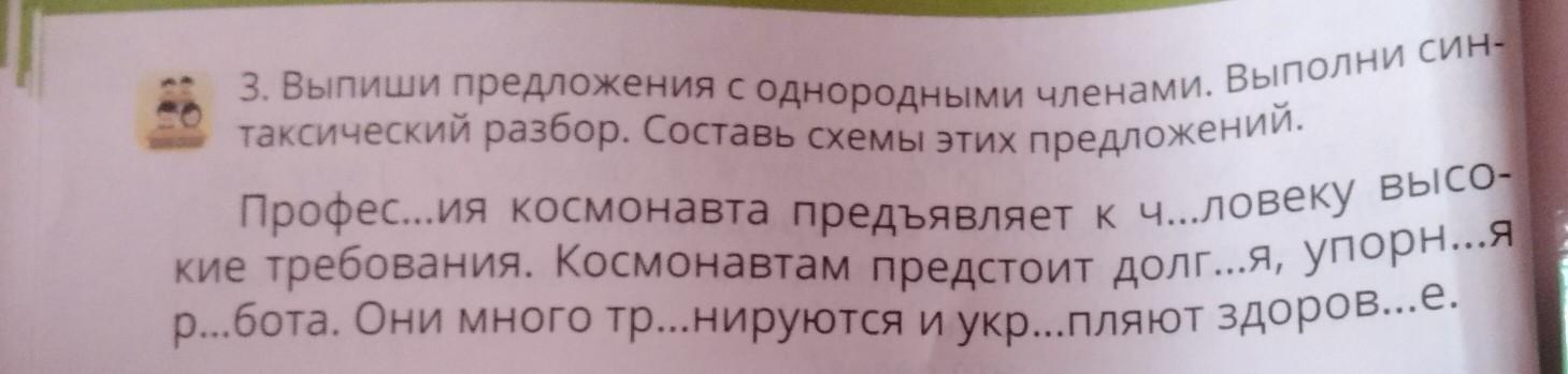 [Профессия (подлежащее) Космонавта предъявляет(сказуемое) человеку высокие требования]. (Повеств., невоск., простое, двус., распрастр.) [_=]. [Космонавтам(подлежащее) предстоит(сказуемое) долгая и упорная работа]. (Повеств., невоск., простое, двус., распрастр.)[_=]. [Они много тренируются и укрепляют здоровье].(Повеств., невоск., простое, двус., распрастр., осл. одн. сказ) [_= и =].
