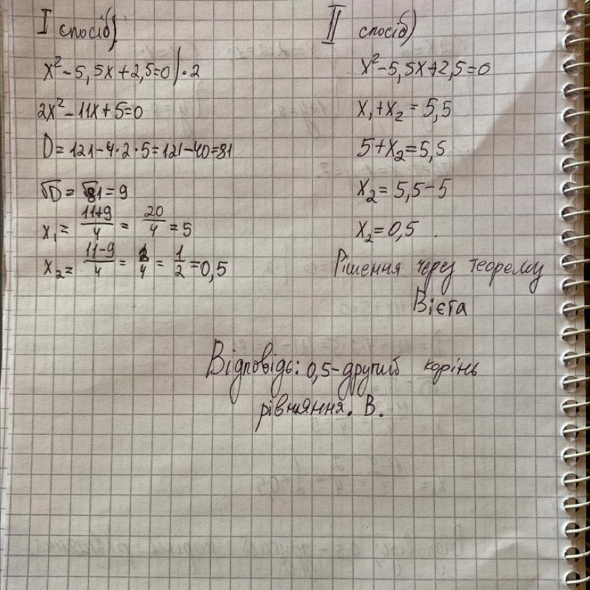 Один із коренів рівняння х²-5,5х+2,5=0 дорівнює 5. Знайдіть другий корінь