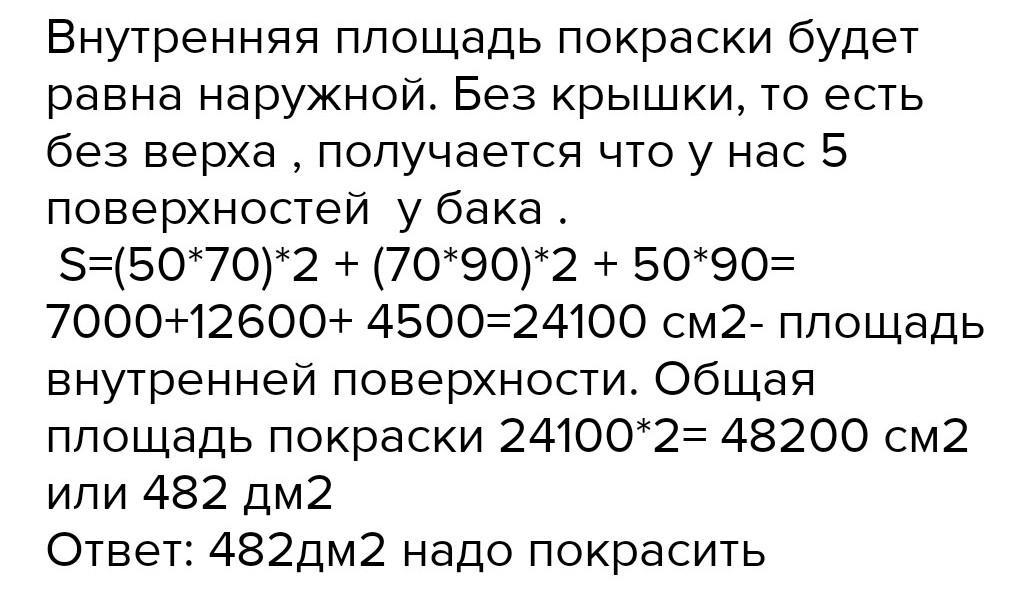 Из жести сделан бак без крышки. Он имеет форму прямоугольного параллелепипеда длиной 50 см, шириной 70 см и высотой 90 см. Бак надо покрасить внутри и снаружи. Какую площадь надо покрасить?