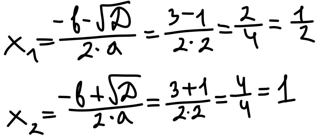 D=b² - 4 * a * c=9 - 4 * 2 * 1=9 - 8=1