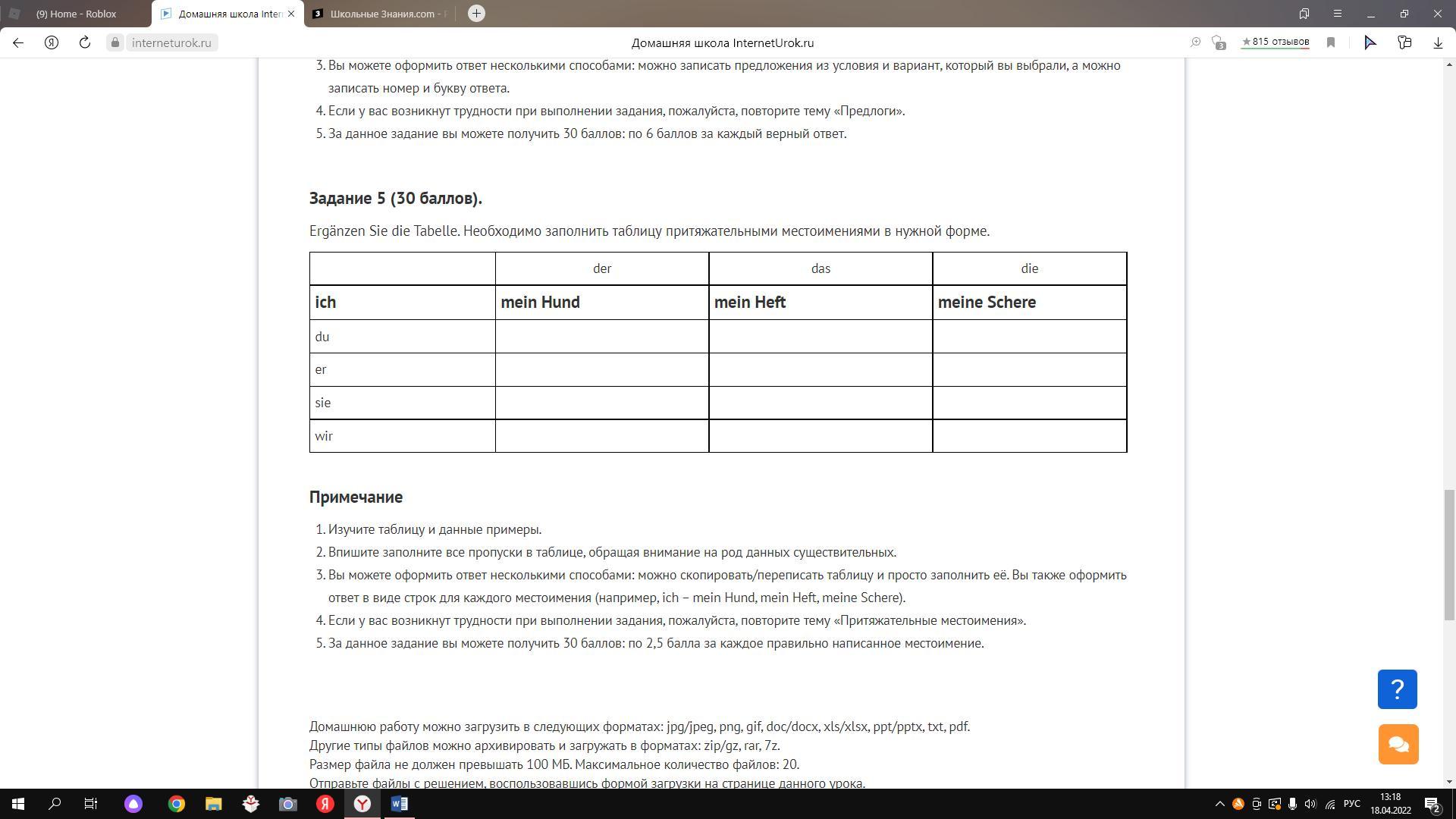 Ergänzen Sie die Tabelle. Необходимо заполнить таблицу притяжательными местоимениями в нужной форме.