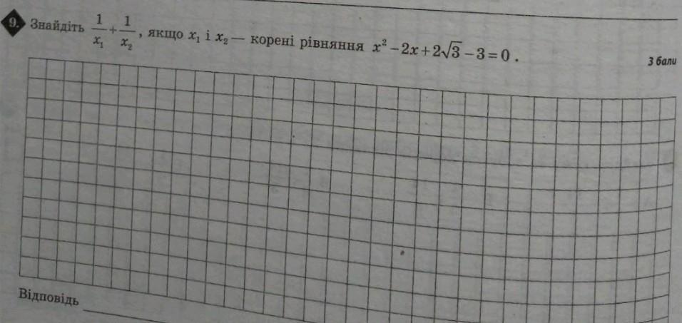 \displaystyle\bf\\x^{2} -2x+2\sqrt{3}-3=0\\\\Teorema \ Vieta:\\x_{1}+x_{2}  =2\\\\x_{1} \cdot x_{2} =2\sqrt{3} -3\\\\\\\frac{1}{x_{1} } +\frac{1}{x_{2} } =\frac{x_{1} +x_{2} }{x_{1} \cdot x_{2} } =\frac{2}{2\sqrt{3} -3}
