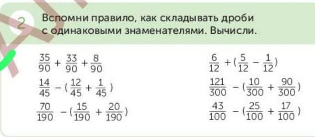 Вспомни правило, как складывать дроби с одинаковыми знаменателями. Вычисли. 5 6 12 121 1 12 90 10 35 33 8 + + 90 90 12 1 45 45 45 70 190 + - 1 320 - 300 + ( 106 - 200 + 100 14 - 13 + ) ( 20-156 + 20 ) 43 25 17 )