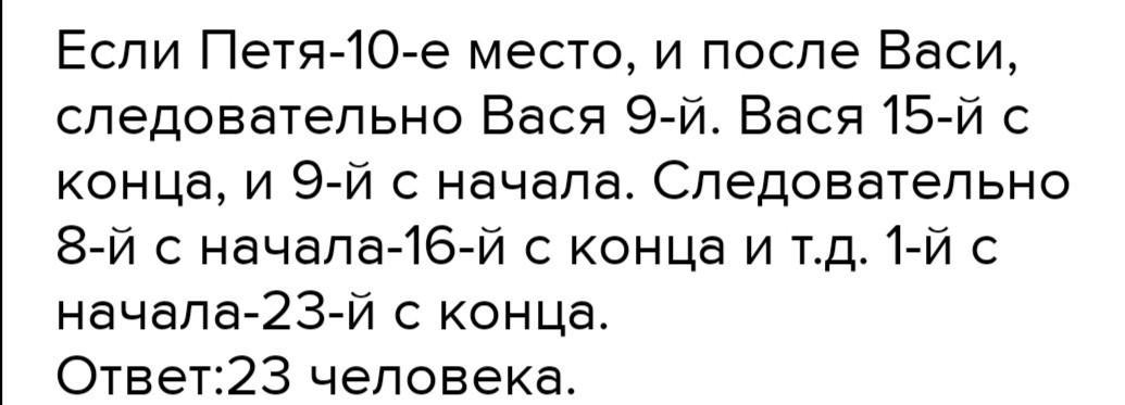 Задача. Петя и Вася участвовали в велогонке. Все участники стартовали одновременно и на финише различное время. Петя финишировал сразу после Васи и оказался на десятом месте. Сколько человек участвовало в гонке, если Вася был пятнадцатым с конца?