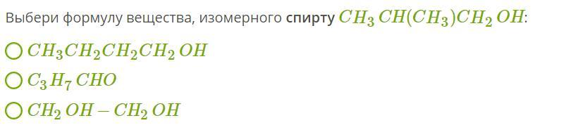 Изомеры -- это вещества, имеющие одинаковый состав, но разное строение. Сразу из определения следует, что третье вещество нам не подходит, так как данное в условии вещество имеет 4 атома углерода, а вещество под номером 3 имеет 2 атома углерода. Вещество под номером 2 тоже не подходит, так как оно имеет 8 атомов водорода, а данное в условии вещество -- 10 атомов водорода. Остается первый вариант. Он и является изомером для данного в условии спирта.