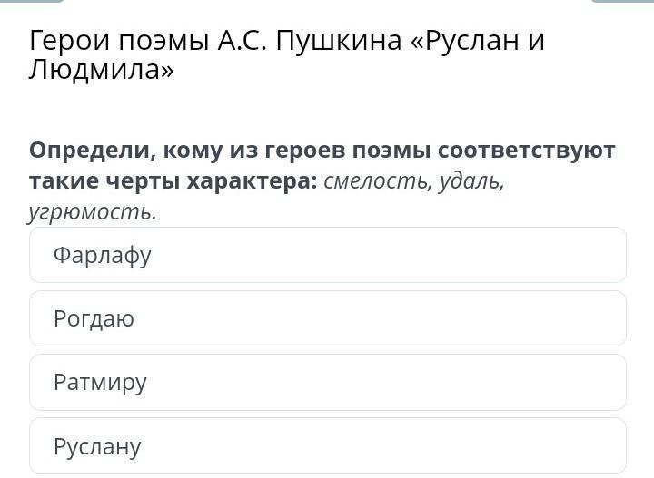 Определи, кому из героев поэмы соответствуют такие черты характера: смелость, удаль, угрюмость. Фарлафу Рогдаю Ратмиру Руслану