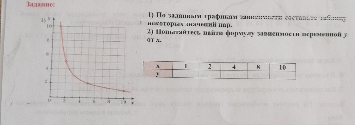 10 1) По заданным графикам зависимост состарате 2 некоторых значений пар. 2) Попытайтесь найти формулу зависимости переменной у от х. 6 х 1 2 4 8 10 y 2 10