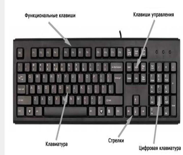 Клавиатура - это одно из основных устройств ввода используемых на компьютере. Она очень похожа на клавиатуру электрических пишущих машинок, с некоторыми дополнительными клавишами. Компьютерная клавиатура позволяет осуществлять ввод букв, цифр и других символов в компьютер. Ниже приведен пример клавиатуры, с подписанными основными частями.