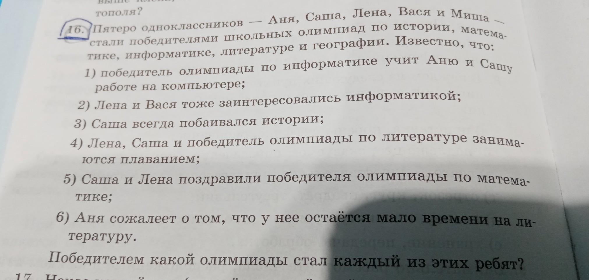 Олимпиаду по математике выйграла Аня; по географии - Саша; по истории - Лена; по литературе - Вася; по информатике- Миша