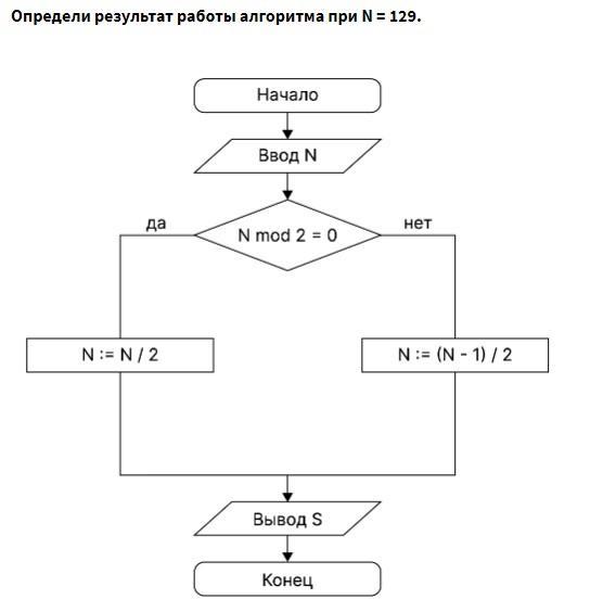 N = 64, але алгоритм виводить S, яке не було ініціалізовано, якщо це помилка і виводитись мало N, то буде виведено число 64, якщо ні, то буде виведено 0