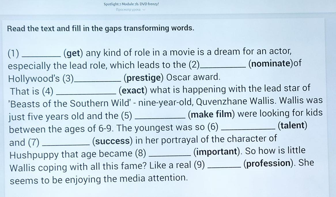 1) get 2) nomination 3) prestigious 4) more exactly 5) film creators 6) talented 7) successful 8) unimportant 9) professional
