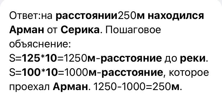 ДОМАШНЕЕ ЗАДАНИЕ 9 Реши задачу. Серики Арман Одновременно выехали на велосипедах из по- сёлка к реке. Через 10 минут Серик, ехавший со скоростью 125 м/мин, был у реки. На каком расстоянии от него находил- ся Арман, если он ехал со скоростью 100 м/мин? 12 00 - 2 20 ус = 125 м/мин t = 10 мин река S = ? м AKI VA = 100 м/мин ПОДЕЛИСЬ ПРЕДЛОЖИ ПРИДУМАЙ