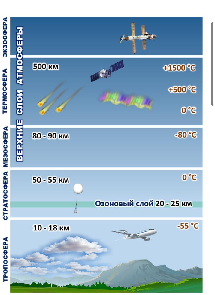 Ответ:Атмосфера состоит из 5 слоёв. Нижние слои атмосферы — тропосфера и стратосфера — содержат почти весь воздух Земли. Тропосфера — самый нижний и наиболее плотный слой атмосферы. Стратосфера — второй слой от поверхности земли. А выше 50-55 км распологаются верхные слои — мезосфера, термосфера, экзосфера.