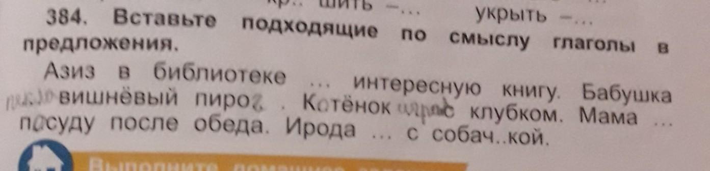 по B укрыть -.. 384. Вставьте подходящие смыслу глаголы предложения. Азиз в библиотеке интересную книгу. Бабушка ru.J0 вишнёвый пиро, . Котёнок илрос клубком. Мама ... посуду после обеда. Ирода ... с собач..кой.