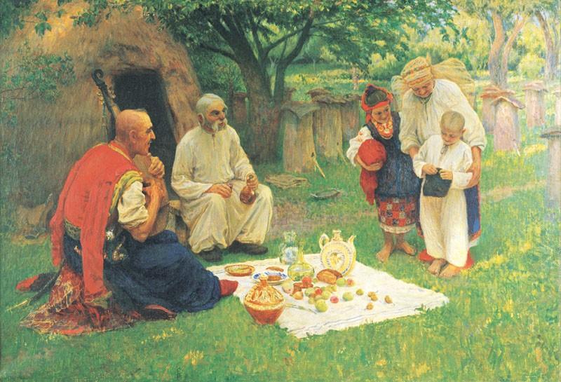 на картине изображено как вся семья постелила на газон маленький столик ( типо того) .