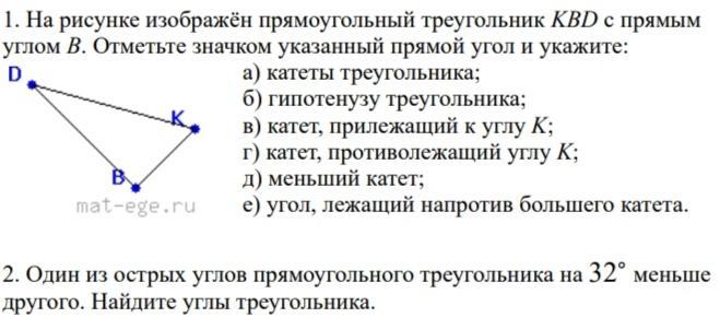 2. Один из острых углов прямоугольного треугольника на 32° меньше другого.