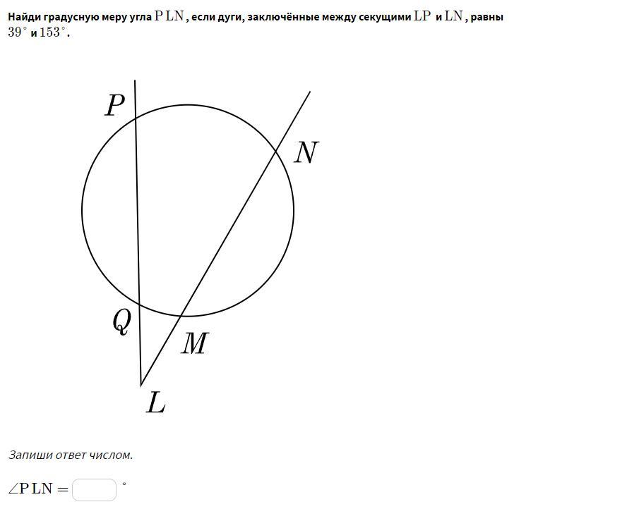 Сначала складываем дуги LP и LN, что бы найти дугу PLN, следовательно 39°+153°=192°