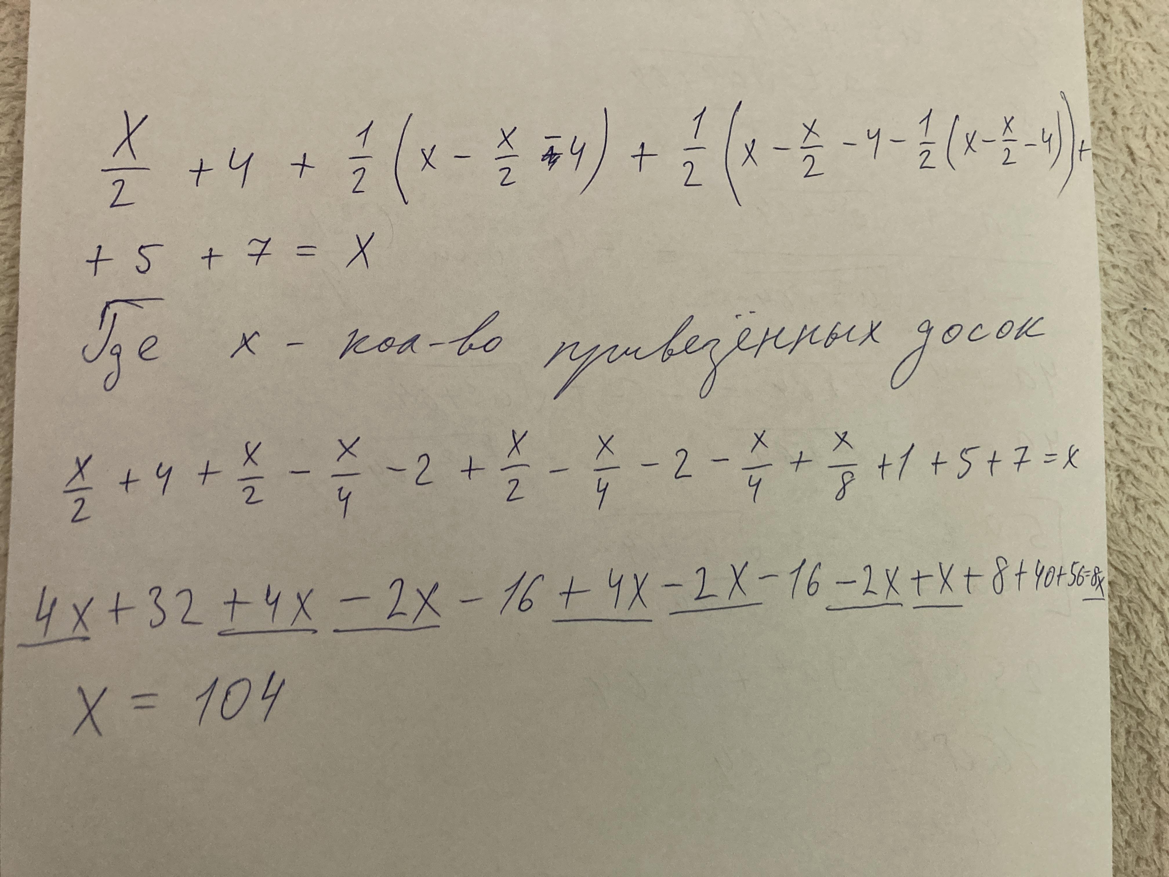 Реши задачу (с конца). На строительство веранды привезли доски. Для пола подготовили половину досок и ещё 4, для крыши половину остатка и ещё 6, для стен половину последнего остатка и ещё 5. После этого осталось 7 досок. Ск. привезли досок?