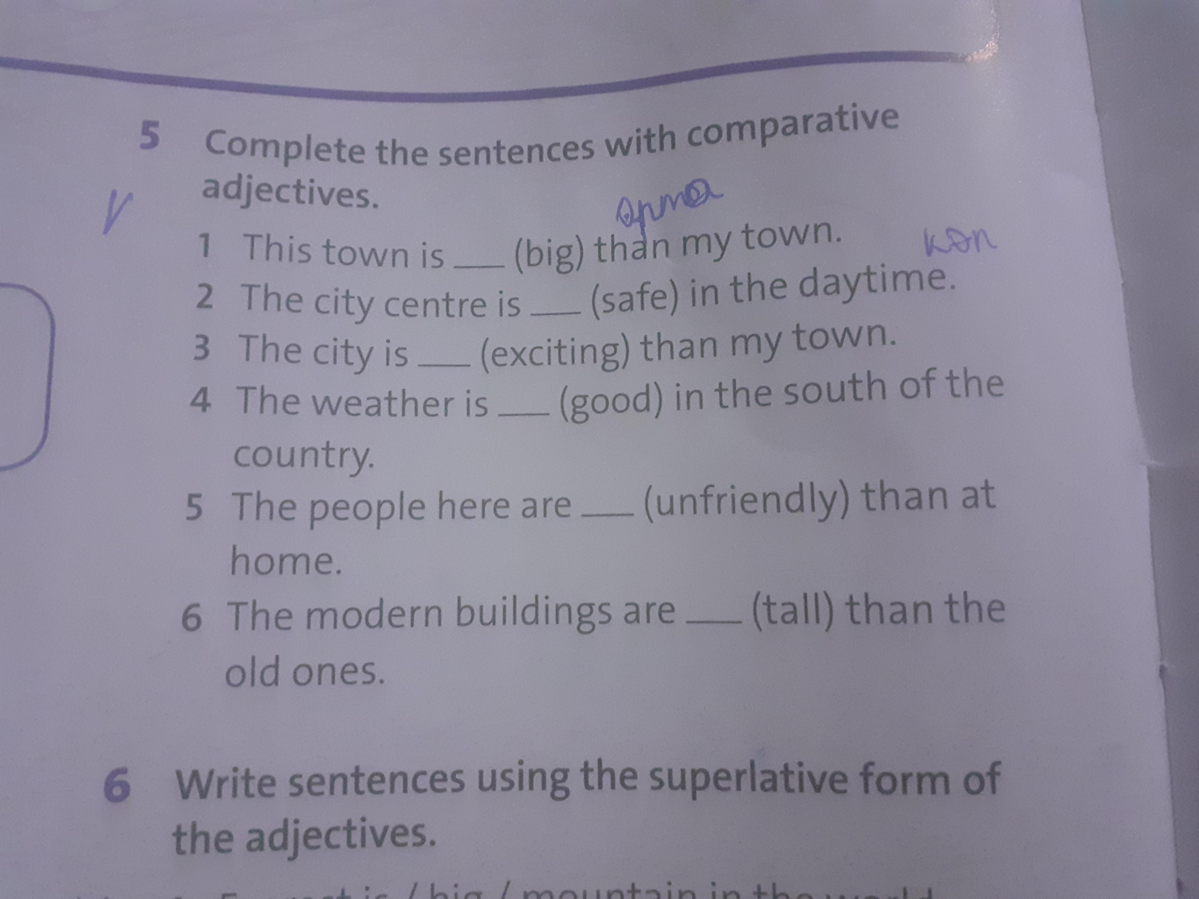 1. bigger 2. the safest 3. more exciting 4. the best 5. more unfriendly 6.taller