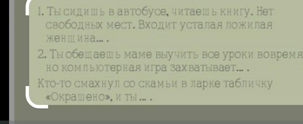 1. Ты сидишь в автобусе. Читаешь книгу. Нет свободных мест. Входит усталая пожилая женщина. Она просит уступить место. Ты уступаешь ей место.