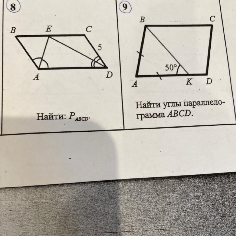 девятая: отсечен равнобедренный треугольник, а значит, BK - биссектриса. помним теоремы о параллельных прямых? угол BKA = углу KCB, то бишь целый угол ABC = 50*2 = 100. по теореме, сумма двух прилежащих углов в параллелограмме = 180 => второй угол = 180 - 100 = 80.