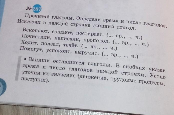Прочитай глаголы. Определи время и число глаголов. Исключи в каждой строчке лишний глагол.
