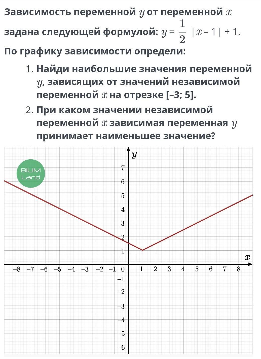 |x – 1| + 1. По графику зависимости определи: Найди наибольшие значения переменной y, зависящих от значений независимой переменной x на отрезке [–3; 5]. При каком значении независимой переменной x зависимая переменная y принимает наименьшее значение?