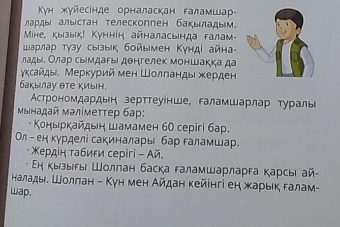 Күн жүйесінде орналасқан ғаламшар- ларды алыстан телескоппен бақыладым. Міне, қызық! Күннің айналасында ғалам- шарлар түзу сызық бойымен Күнді айна- лады. Олар сымдағы дөңгелек моншаққа да ұқсайды. Меркурий мен Шолпанды жерден бақылау өте қиын. Астрономдардың зерттеуінше, ғаламшарлар туралы мынадай мәліметтер бар: Қоңырқайдың шамамен 60 серігі бар. Ол – ең күрделі сақиналары бар ғаламшар. - Жердің табиғи серігі – Ай. Ең қызығы Шолпан басқа ғаламшарларға қарсы ай- налады. Шолпан - Күн мен Айдан кейінгі ең жарық ғаламшар. 10 вопросов