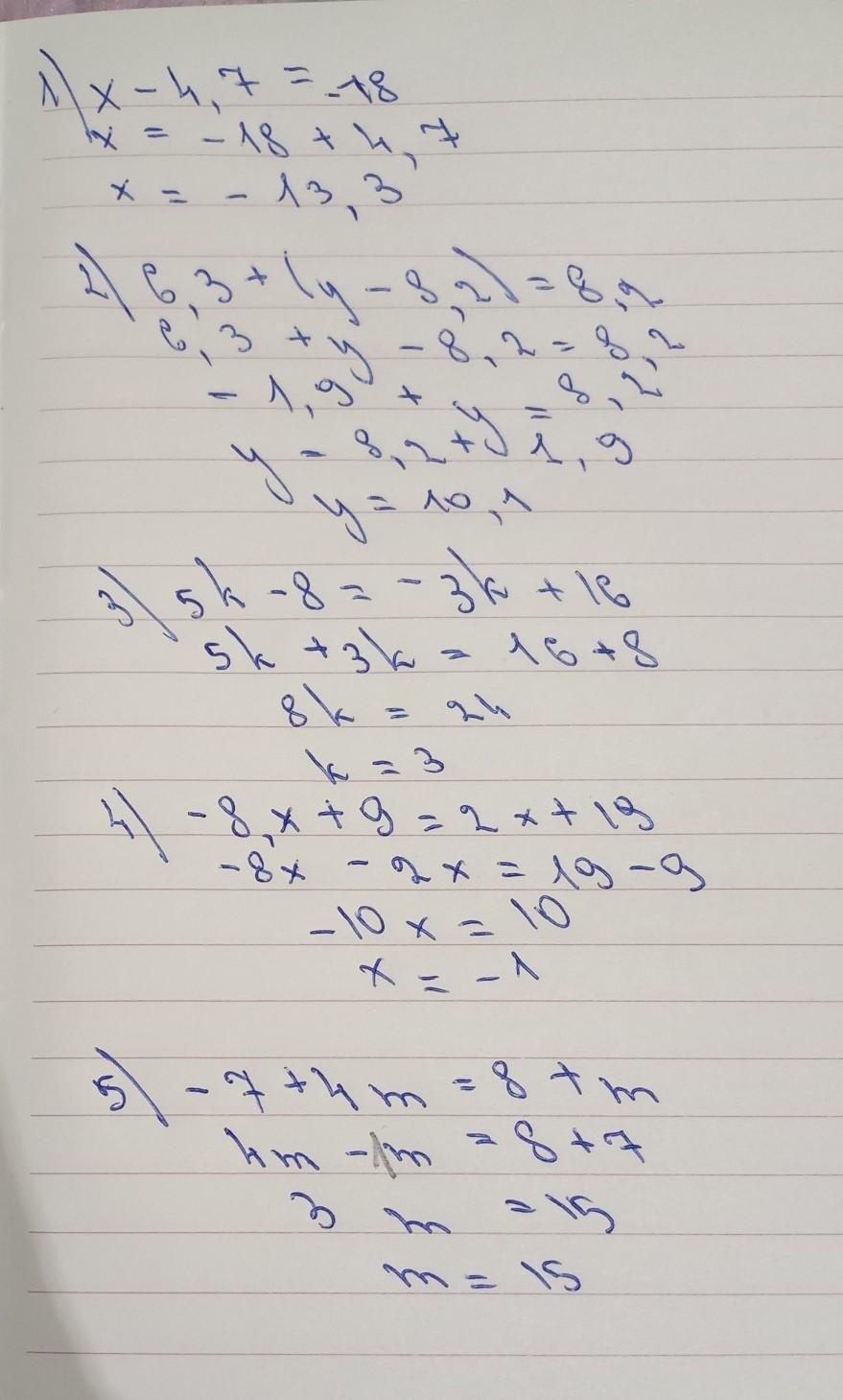 1. Розв;яжіть рівняння: а) х - 4,7 = -18; б) 6,3 + (у - 8,2) = 8. 2. Розв;яжіть рівняння: а) 5k – 8 = -3k + 16; б) -8х + 9 = 2х + 19; в) -7 + 4m = 8 + m; г) 9b + 7 = 4 · (8 - b) + 14. 3. Знайдіть корінь рівняння 4 · (0,2 - 1,2х) - 0,2 · (14 + х) = 1,5.