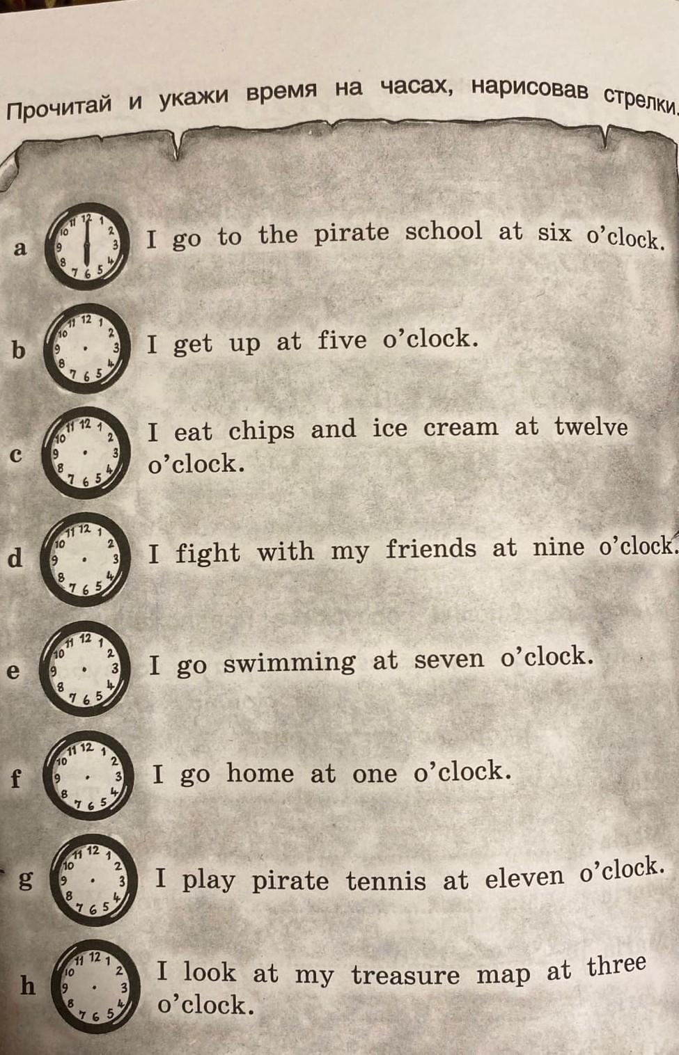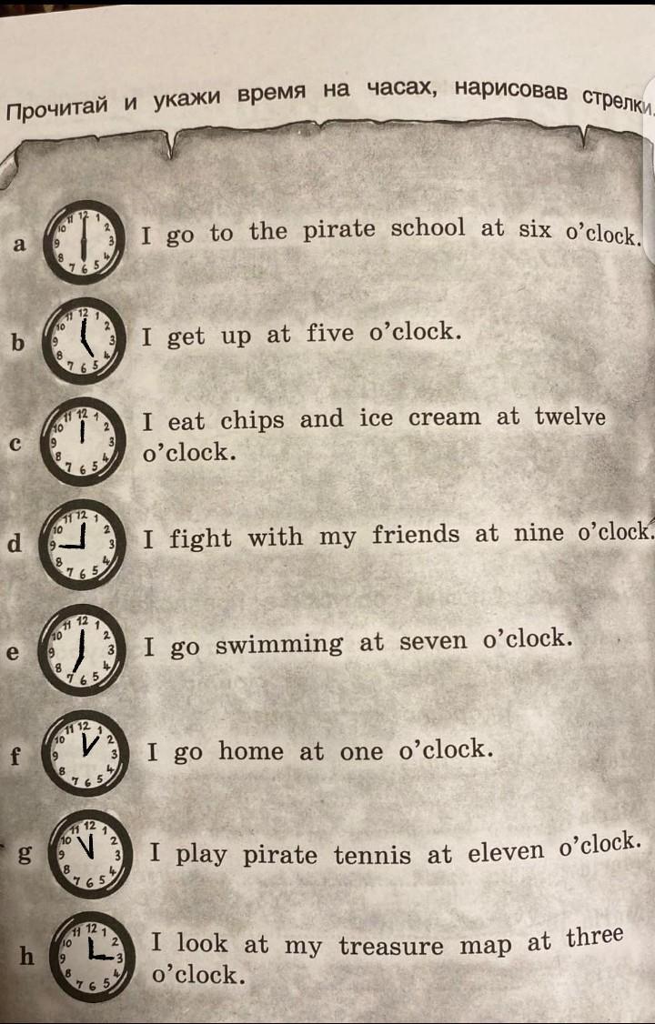 Відповідь: b: пять часов; c: двенадцать; d: девять; e: семь часов; f: первый час; g: одиннадцать часов; h: три часа