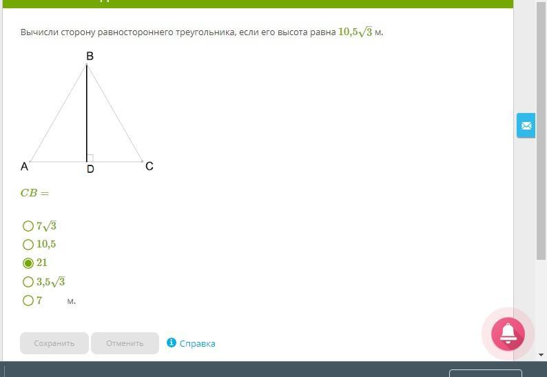 АВ=2*ВD/√3=10,5√3*2/√3=21м