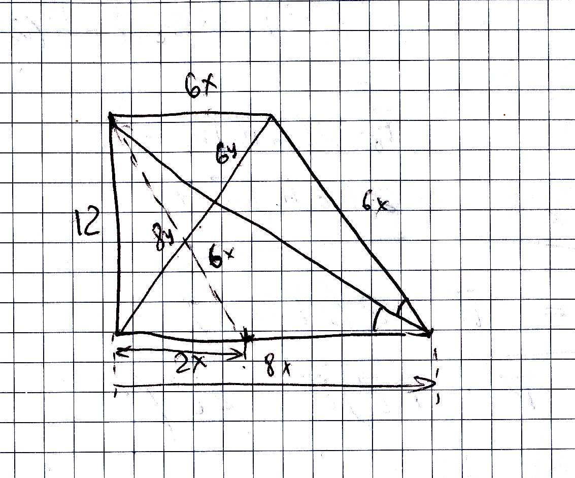 12^2 + (8*x - 6*x)^2 = (6*x)^2; (построили треугольник, проведя прямую, параллельную боковой стороне через другую вершину)