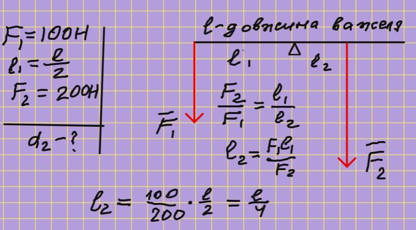На одному кiнцi важiля дiє сила 100 Н.т При цьому точка опори важеля знаходиться посередині. На якій відстані від точки опори необхідно прикласти силу 200н, щоб важіль перебував у стані спокою?