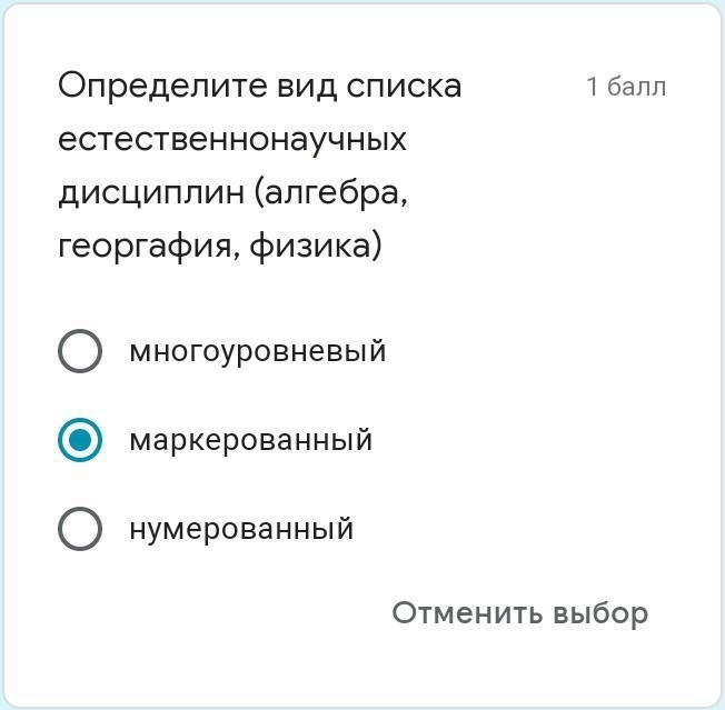 Определите вид списка естественнонаучных дисциплин (алгебра, георгафия, физика)