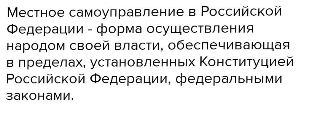 Местное самоуправление в Российской Федерации - форма осуществления народом своей власти, обеспечивающая в пределах, установленных Конституцией Российской Федерации, федеральными законами.