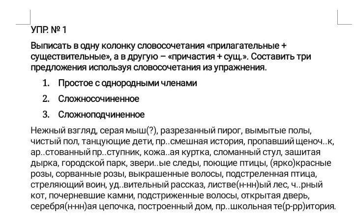 Причастия + существительные: разрезанный пирог, вымытые полы, танцующие дети, пропавший щеночек, арестованный преступник, сломанный стул, зашитая дырка, поющие птицы, сорванные розы, выкрашенные волосы, подстреленная птица, стреляющий воин, почерневшие камни, подстриженные волосы, открытая дверь, построенный дом.
