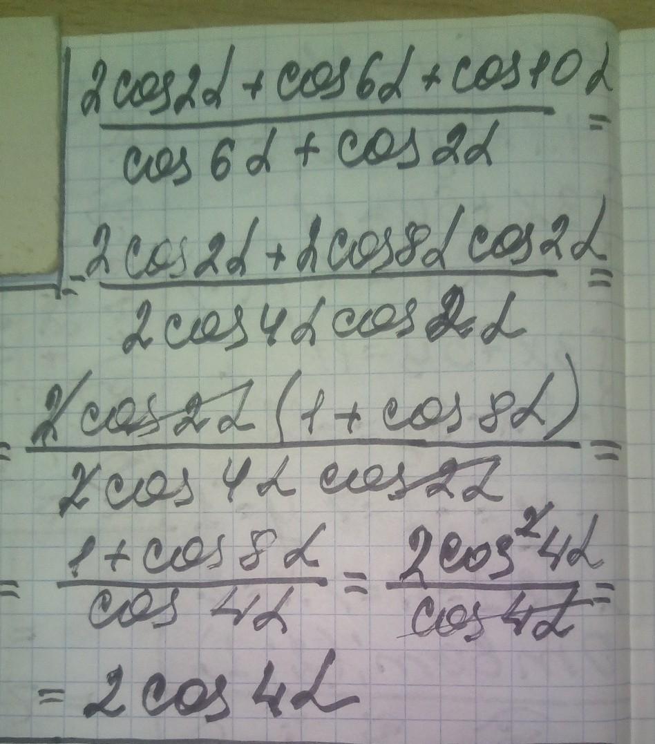 (cos2a+cos2a+cos6a+cos10a)/(cos6a+cos2a)=