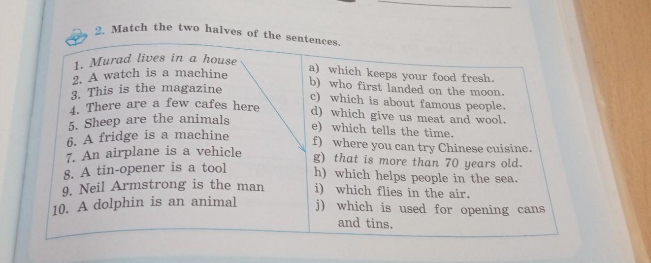 2. Match the two halves of the sentences. 1. Murad lives in a house 2. A watch is a machine 3. This is the magazine 4. There are a few cafes here 5. Sheep are the animals 6. A fridge is a machine 7. An airplane is a vehicle 8. A tin-opener is a tool 9. Neil Armstrong is the man 10. A dolphin is an animal a) which keeps your food fresh. b) who first landed on the moon. c) which is about famous people. d) which give us meat and wool. e) which tells the time. f) where you can try Chinese cuisine. g) that is more than 70 years old. h) which helps people in the sea. i) which flies in the air. which is used for opening cans and tins.