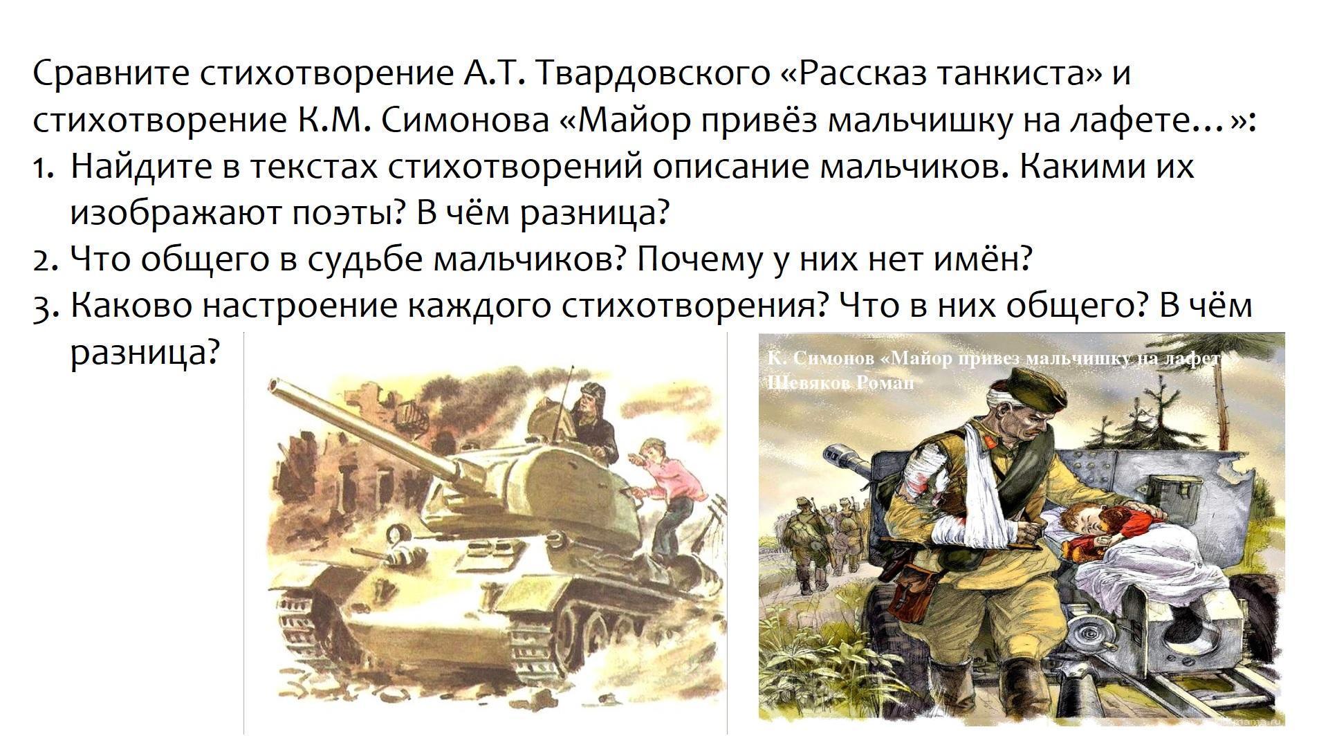 Первый мальчик (на первой фотке, из первого стиха) энергичен, он быстро находит решение проблемы и легко догадывается о последствиях. Он подвижный и ловкий, несмотря на страшный голод и войну. Второй мальчик (из "майор привёз мальчишку на лафете") иллюстрирует последствия войны своей измученностью ("седой мальчишка на лафете спал") и трагедиями его жизни. Оба мальчика испытывали трудности, связанные с военными лишениями, и их обоих можно назвать героями.