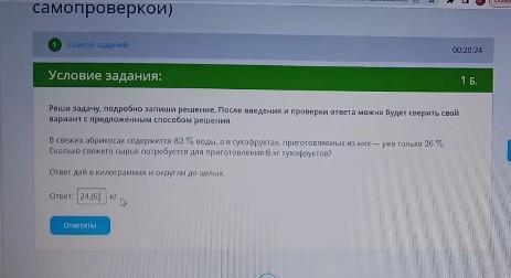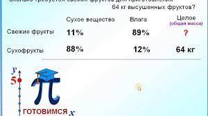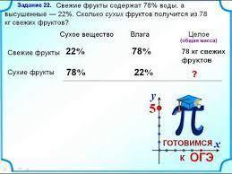 помогите срочно!!! 10 мин осталось! В свежих фруктах 82 % воды а в сухих 26%. Сколько свежего сырья потребуется для приготовления 6 кг фруктов.!!!