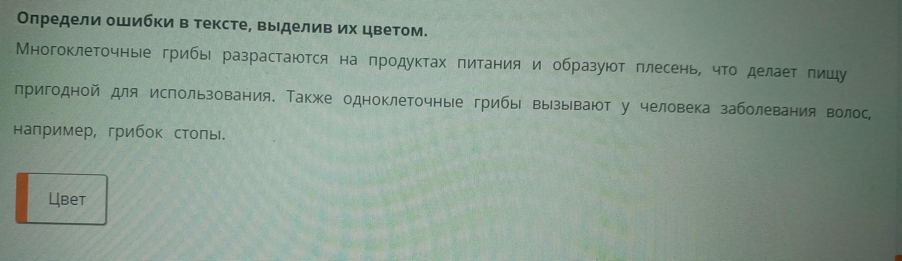 Определи ошибки в тексте, выделив их цветом. Многоклеточные грибы разрастаются на продуктах питания и образуют плесень, что делает пищу пригодной для использования. Также одноклеточные грибы вызывают у человека заболевания волос, например, грибок стопы. Помогите пожалуйста