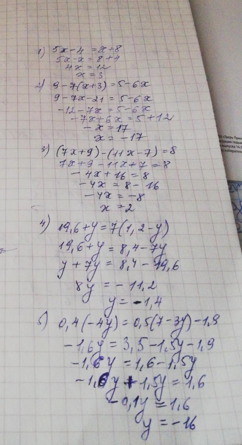 5) 0,4 ( -4y)=0,5(7-3y)-1,9;
