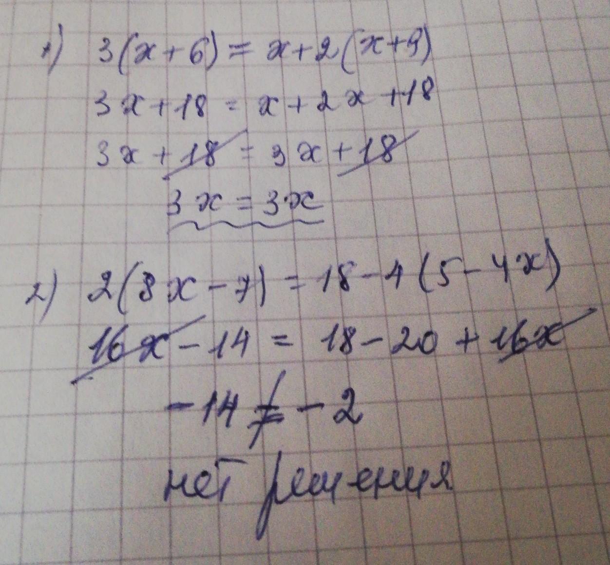 1) 3(x + 6) = x + 2(x + 9) 2 2(8x - 7) = 18 - 4(5 - 4x)