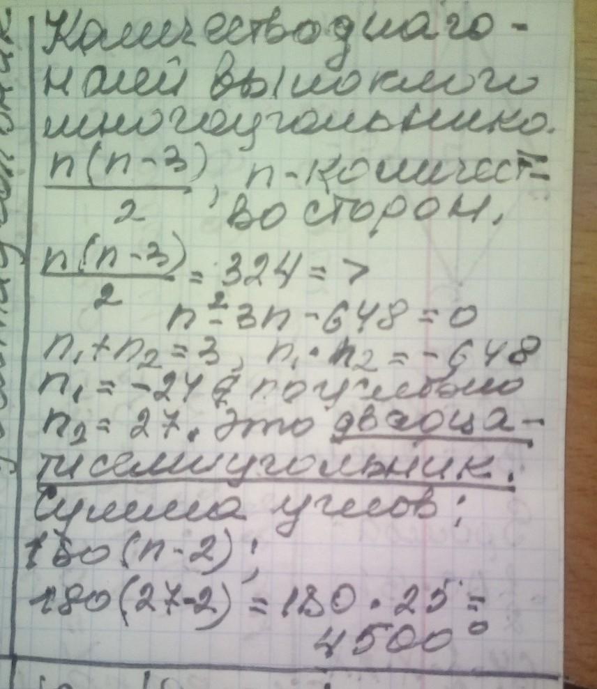 В опуклому многокутнику 324 діагоналей.Знайти сторін і суму кутів