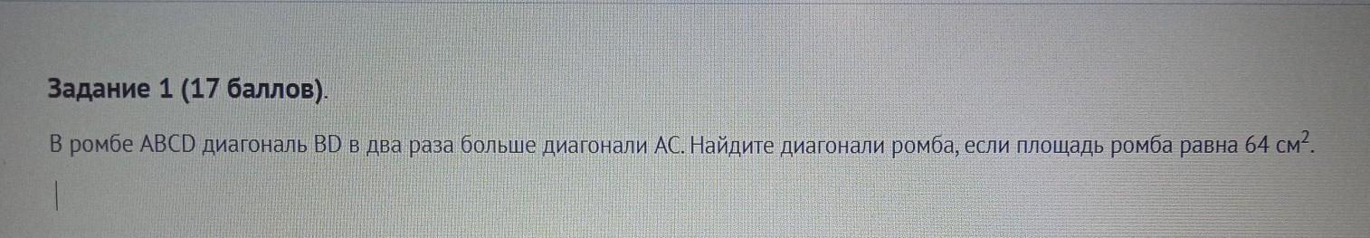 В ромбе ABCD диагональ BD в два раза больше диогонали AC. Найдите диогонали ромба, если площадь ромба равна 64 см в квадрате.