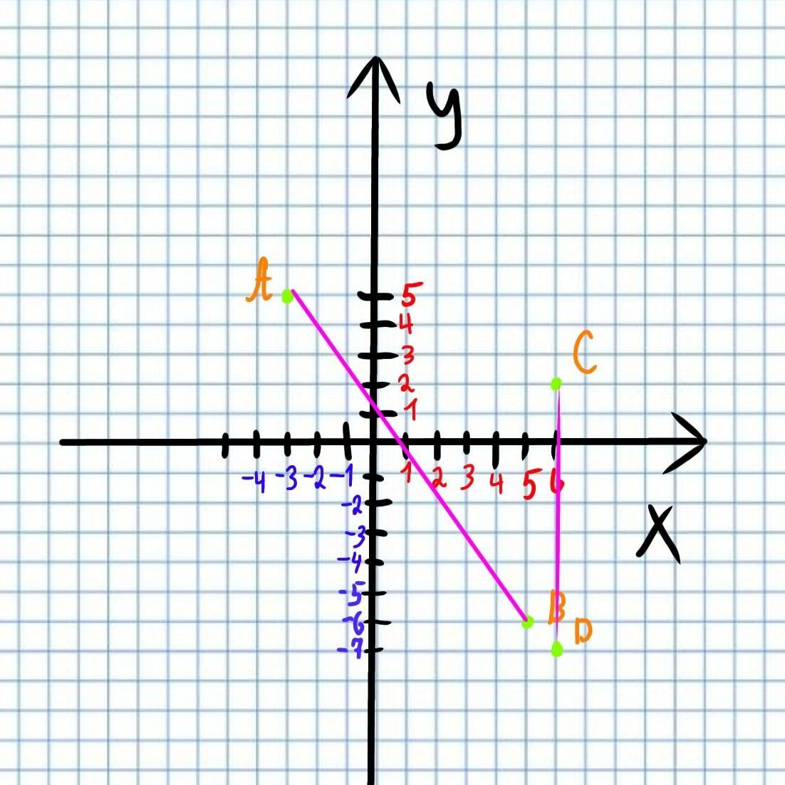 побудуйте відрізок ab і cd, якщо A(-3: 5) B( 5; -6) С(6:2) D(6:-7)
