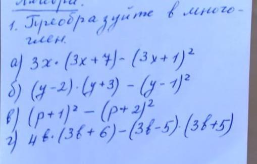 а) 3x · (3x + 7) - (3x + 1)² = 9x² + 21x - 9x² - 6x - 1 = 21x - 1