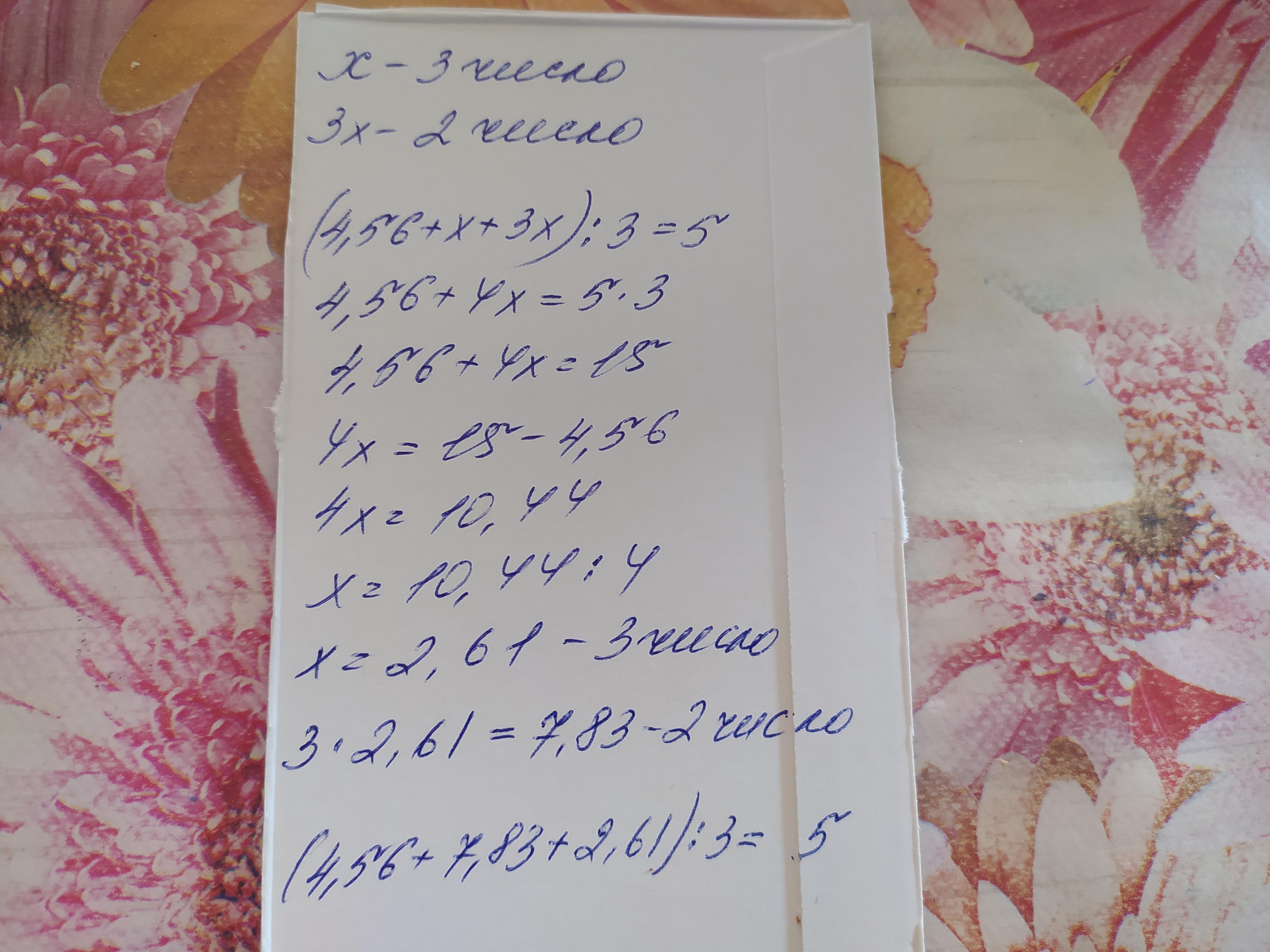 Дано три числа. Перше число дорівнює 4,56; друге число у 3 рази більше від третього. Середнє арифметичне трьох чисел дорівнює 5. Знайдіть друге і третє числа