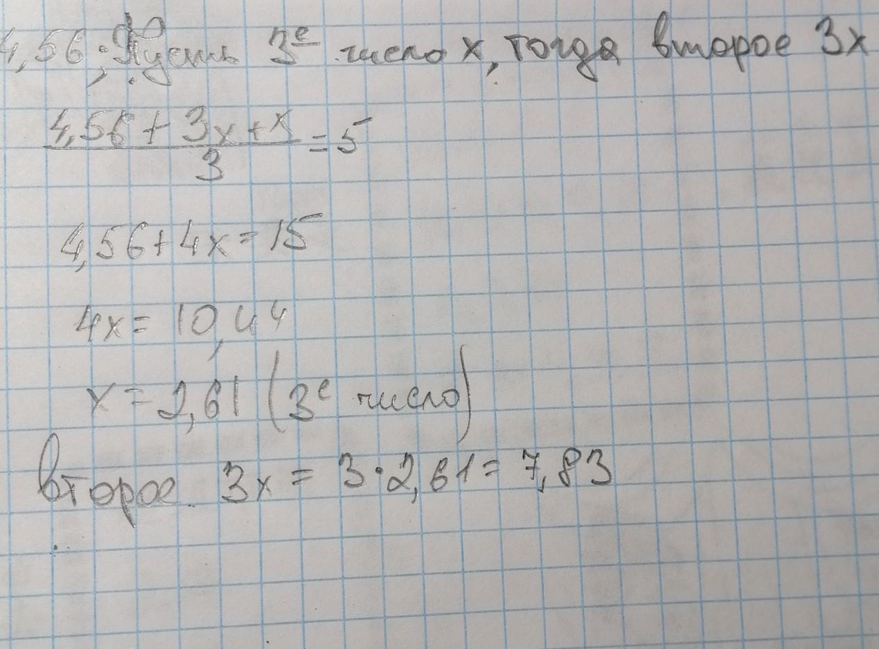 Дано три числа. Перше число дорівнює 4,56; друге число у 3 рази більше від третього. Середнє арифметичне трьох чисел дорівнює 5. Знайдіть друге і третє числа