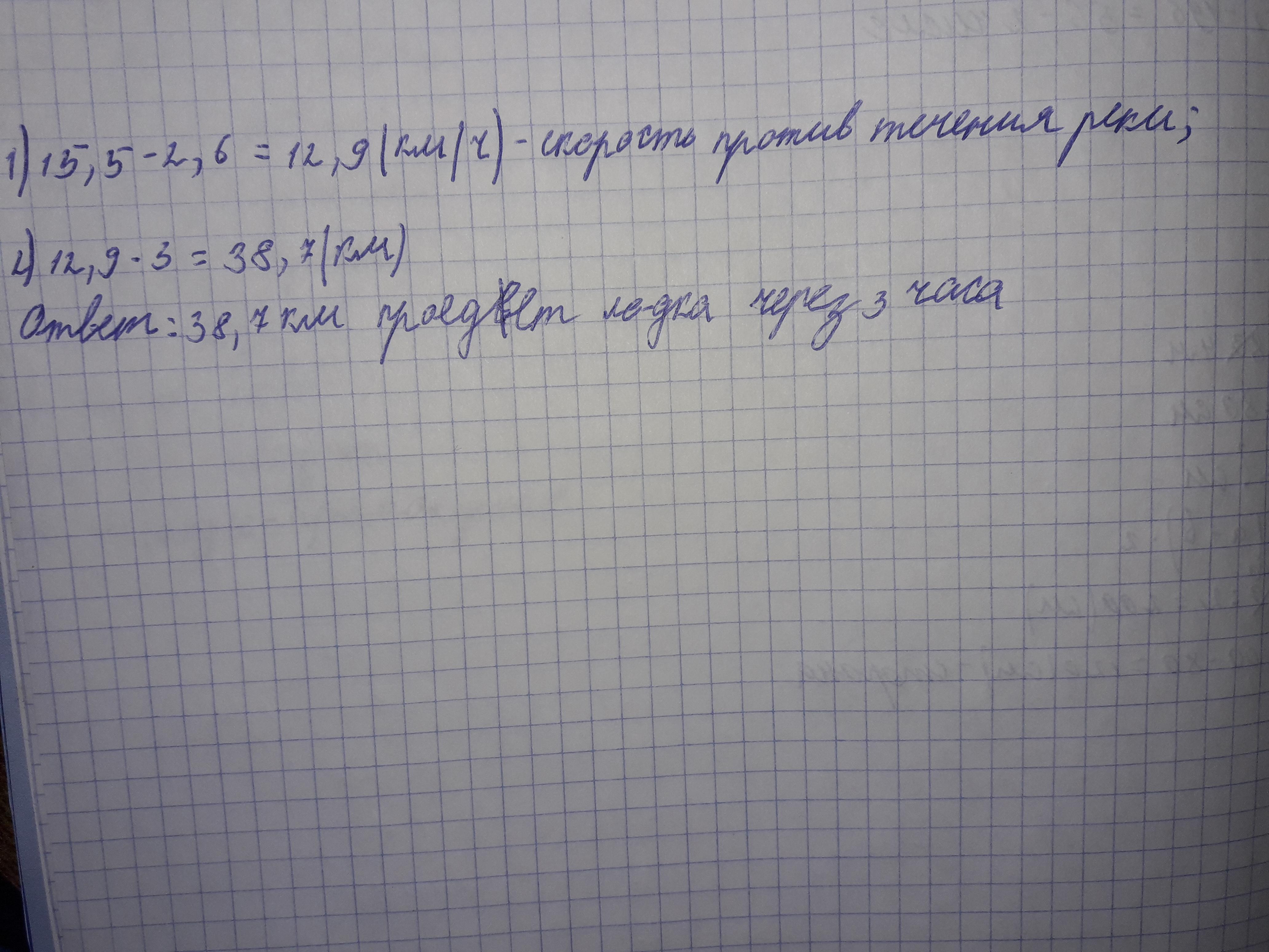 Решите задачу. Собственная скорость моторной лодки 15,5 км/ч, а скорость течения реки 2,6 км/ч. Какой путь пройдёт моторная лодка против течения за 3 часа?